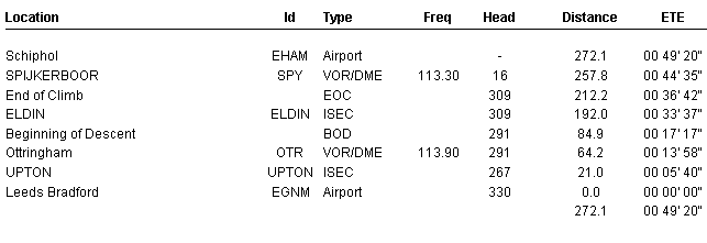 FL.NO: UKD107 From : EHAM AMSTERDAM SCHIPOL To : EGNM LEEDS BRADFORD Alt : EGGP LIVERPOOL (HDG 239M 53NM FROM EGNM) ETD 09:00Z ALT :31,000 ETA 09:55Z MACH :0.77 ETE 00:55 A/C :ERJ-145 FUEL 1,001KG SET :3,485KG