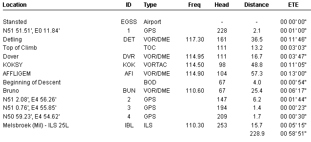 FL.NO: UKD204 From : EGSS STANSTED To : EBBR BRUSSELS Alt : CHARLEROI ETD 19:00Z ALT :23,000 ETA 20:00Z MACH:0.51 ETE 01:00 A/C :ATP FUEL 1380KG SET :2700KG