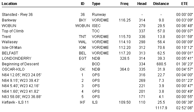 FL.NO: UKD226 From : EGSS STANSTED To : BIKF KIFLAVIK Alt : REKYAVIK ETD 15:20Z ALT :33,000 ETA 18:00Z MACH:0.74 ETE 02:40 A/C :B737-200 FUEL 6600 kg SET :10,000KG