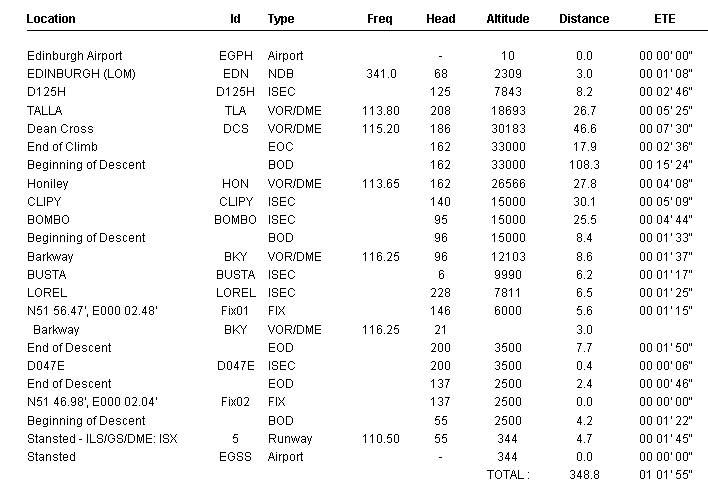 FL.NO: UKD283 From : EGPH EDINBURGH To : EGSS STANSTED Alt : EGGW LUTON ETD 14:50Z ALT :33,000 ETA 15:50Z MACH:0.74 ETE 01:00 A/C :B737-200 FUEL 2600kg SET :5,500KG