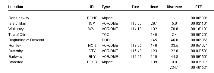 FL.NO: UKD291 From : EGNS ISLE OF MAN To : EGSS STANSTED Alt : EGGW LUTON ETD 12:00Z ALT :29,000 ETA 13:00Z MACH:0.76 ETE 01:00 A/C :ERJ-145 FUEL 790KG SET :2300KG